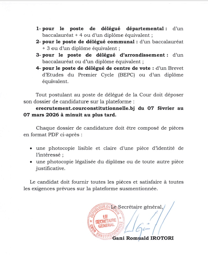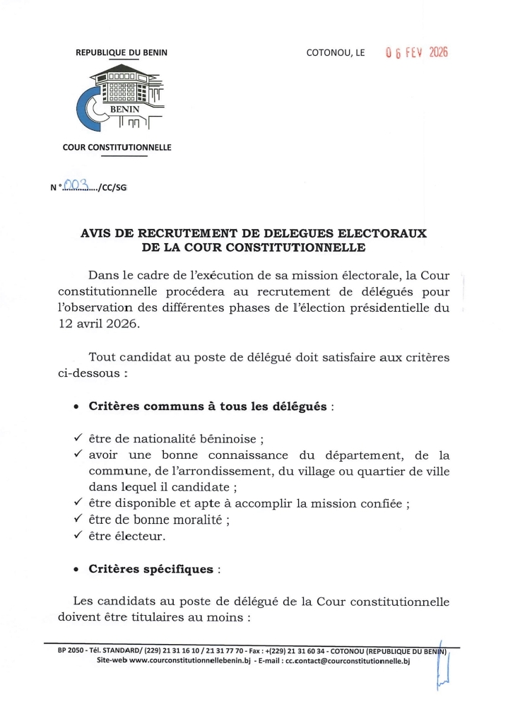 Les postulants sont invités à soumettre leurs dossiers via la plateforme erecrutement.courconstitutionnelle.bj, du 7 février au 7 mars 2026 à minuit. Cette initiative vise à renforcer la transparence et la régularité du scrutin présidentiel, en assurant la présence d’observateurs de la haute juridiction dans l’ensemble des bureaux de vote.