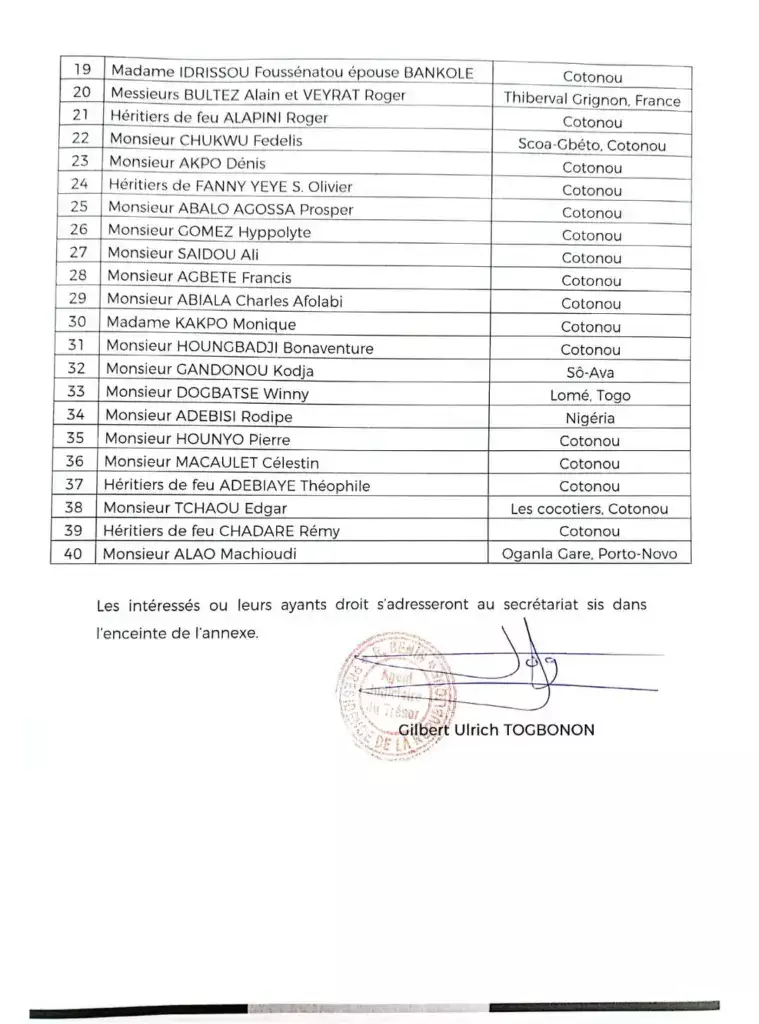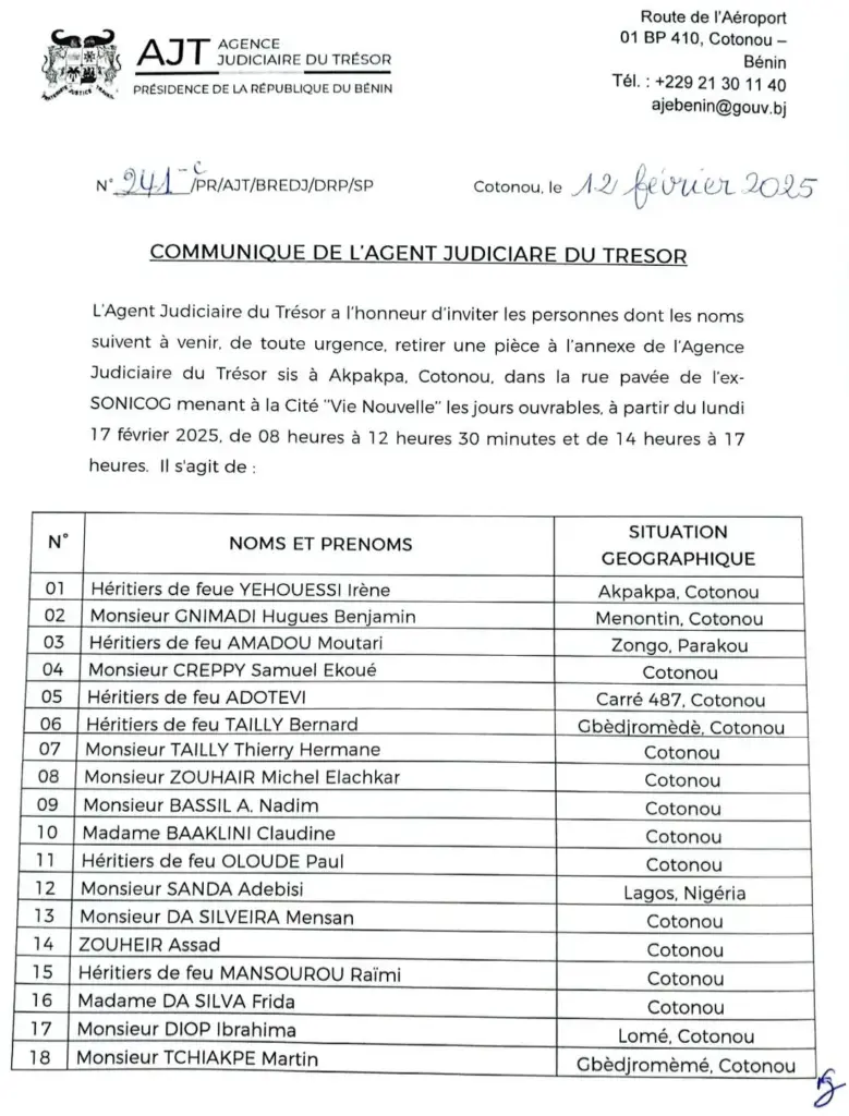 Bénin : l’Agent judiciaire du Trésor convoque 40 personnes pour le retrait urgent d’une pièce