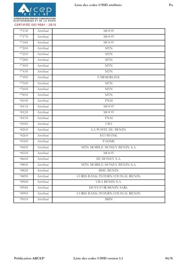 Ci-dessous, la liste des codes USSD autorisées au Bénin :