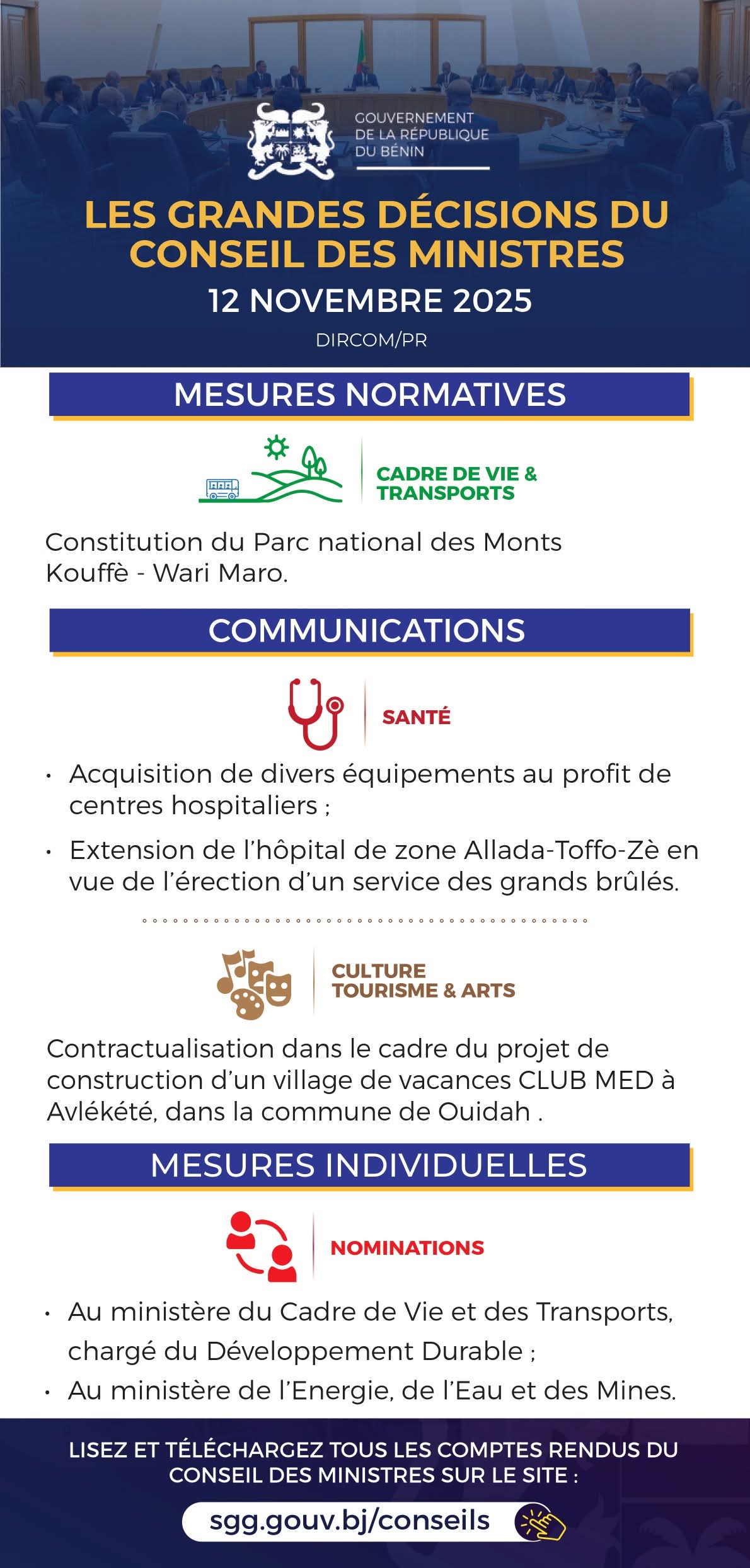 Réuni ce mercredi 12 novembre 2025, le gouvernement béninois a pris plusieurs décisions majeures dans le cadre de la mise en œuvre de son programme d’action de développement.