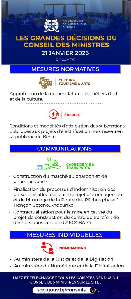 Bénin : les grandes décisions du conseil des ministres du 21 janvier 2026