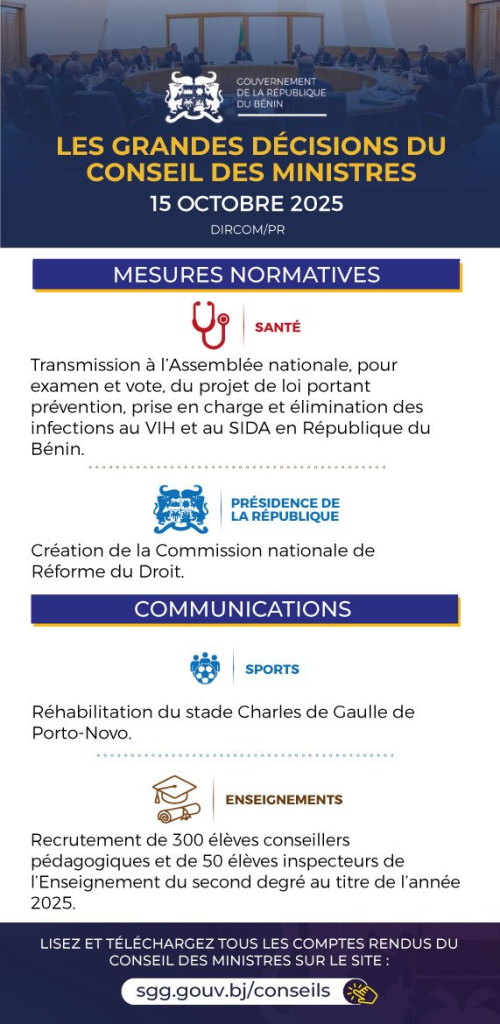 Le Conseil des Ministres s’est réuni mercredi, le 15 octobre 2025, sous la présidence de Patrice Talon, Président de la République, Chef de l’État, Chef du Gouvernement. Les décisions ci-après ont été prises:
