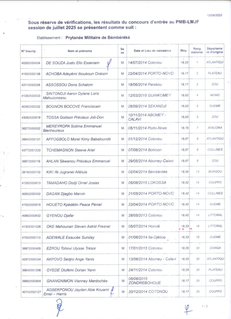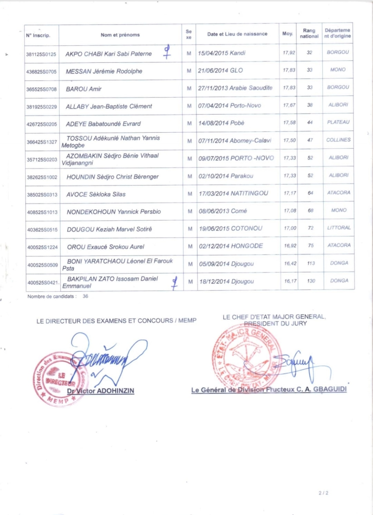 Au Prytanée militaire de Bembèrèkè, 36 garçons figurent sur la liste des admis. De Souza Justo Elio Essenam, (Atlantique), décroche la première place avec 19,33 de moyenne, suivi de Achoba Adeyémi Iboukoun Onésim (19,17, Plateau) et Assossou Dona Schalom (19,17, Zou). Les moyennes oscillent entre 16,17 et 19,33 pour ce groupe.