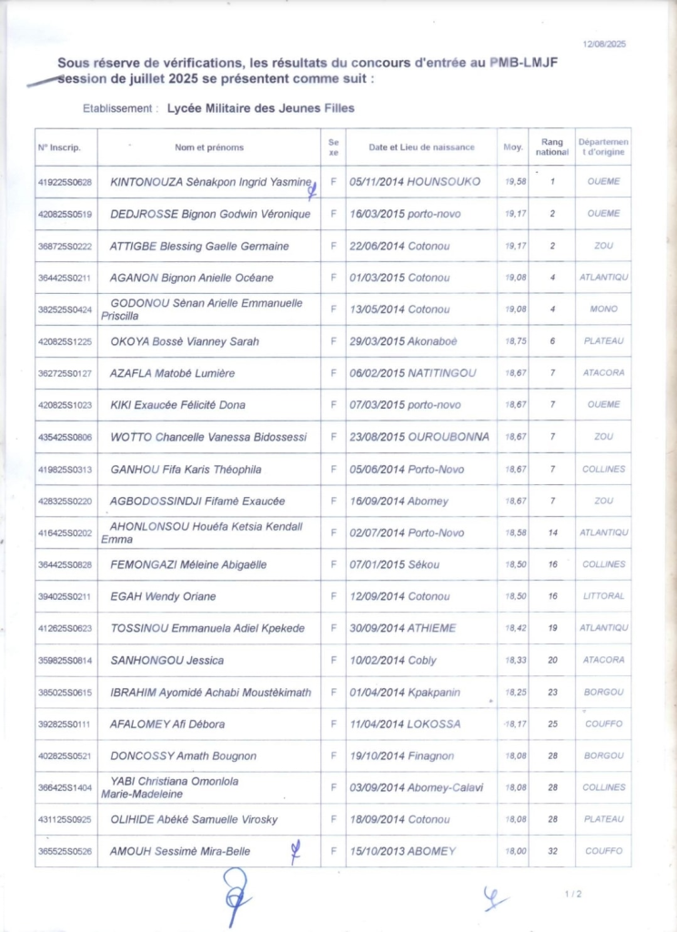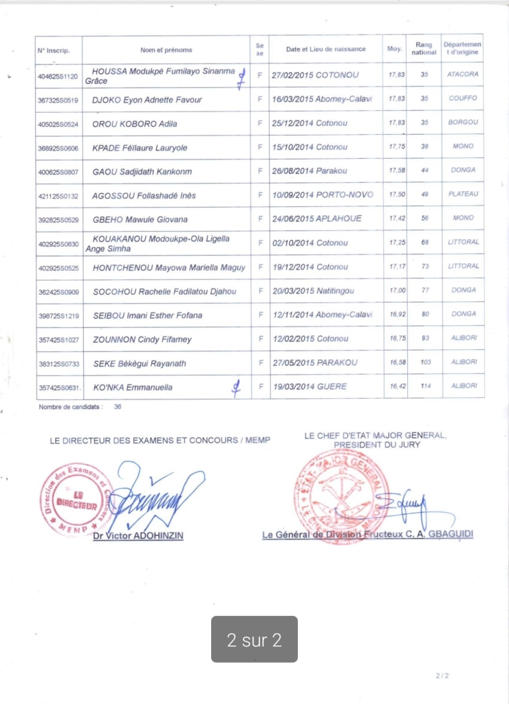 Pour le Lycée militaire des jeunes filles, 36 candidates ont été déclarées admises. En tête du classement figure Kintonuza Sénakpon Ingrid Yasmine (Ouémé), avec une moyenne de 19,58.