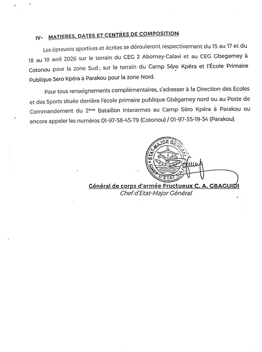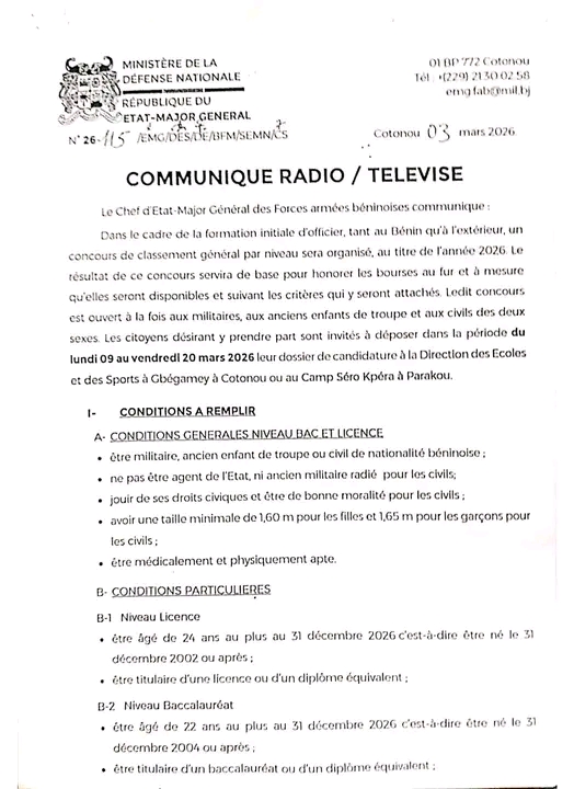 Les Forces armées béninoises ouvrent une nouvelle opportunité pour ceux qui souhaitent faire carrière dans l’armée. Dans un communiqué publié le 3 mars 2026, le Chef d’État-major général, le Général de corps d’armée Fructueux Gbaguidi, a annoncé l’organisation d’un concours de classement général par niveau pour la formation initiale des officiers.