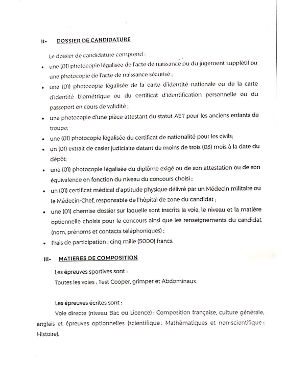 Les personnes intéressées sont invitées à déposer leurs dossiers de candidature du lundi 9 au vendredi 20 mars 2026. Les dépôts se feront à la Direction des Écoles et Sports des Forces armées béninoises à Gbégamey à Cotonou ou au Camp Séro Kpéra à Parakou.