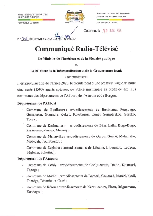 Le gouvernement béninois a lancé une première vague de recrutement de 1 500 agents spéciaux de police municipale dans les départements de l’Alibori, de l’Atacora et du Borgou. Les candidatures sont ouvertes jusqu’au 20 avril 2026.