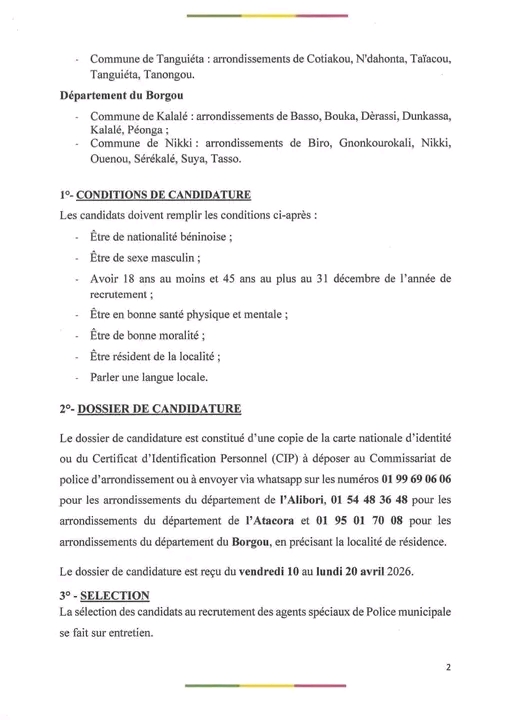 Le recrutement est ouvert aux citoyens béninois de sexe masculin, âgés de 18 à 45 ans. Les candidats doivent résider dans la localité concernée, parler une langue locale, être en bonne santé et justifier d’une bonne moralité.