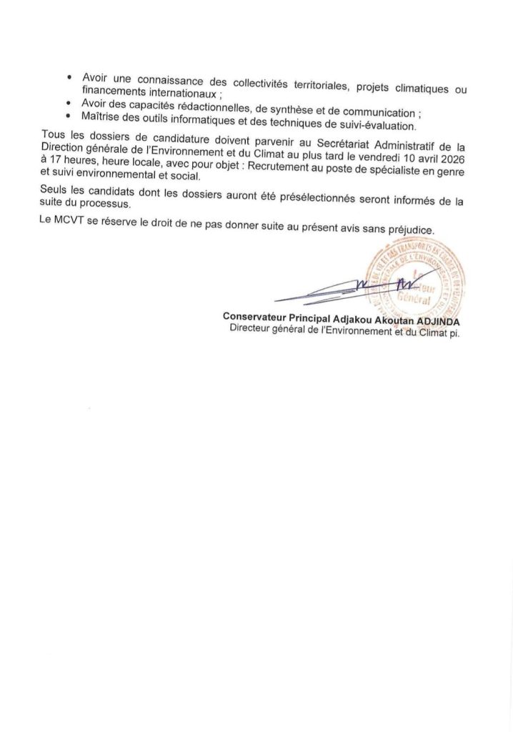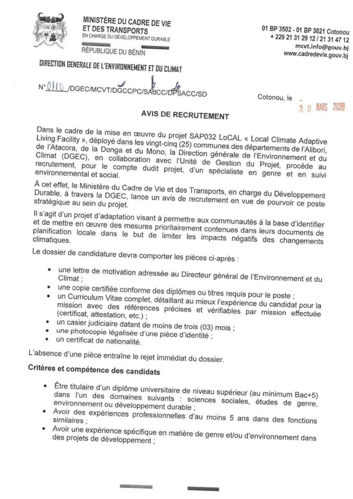 Le gouvernement béninois, à travers le Ministère du Cadre de Vie et des Transports, a publié un avis de recrutement pour renforcer la mise en œuvre du projet SAP032 LoCAL (Local Climate Adaptive Living Facility). Ce projet est déployé dans 25 communes réparties dans les départements de l’Alibori, de l’Atacora, de la Donga et du Mono. Pilotée par la Direction générale de l’Environnement et du Climat (DGEC), en collaboration avec l’Unité de gestion du projet, cette initiative vise à recruter un spécialiste en genre et en suivi environnemental et social.