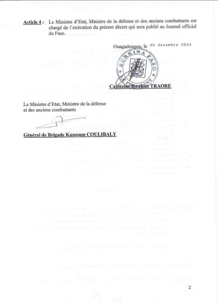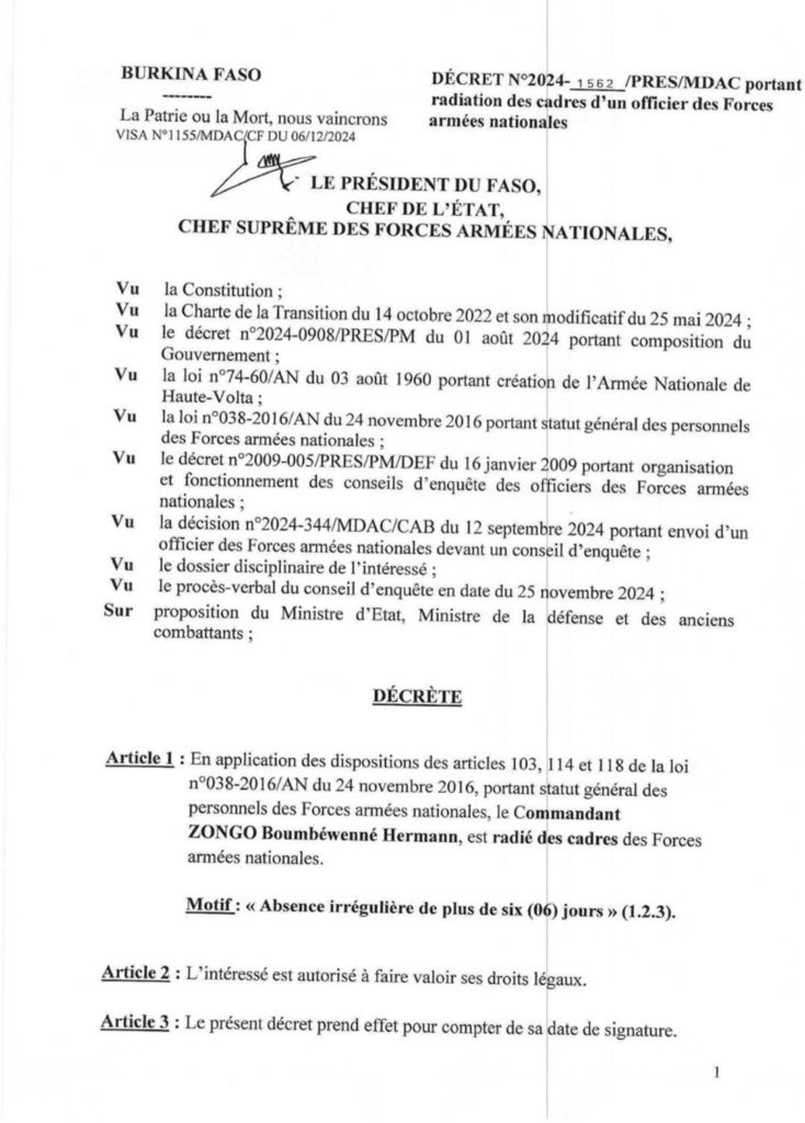 Au Burkina Faso, le commandant Wend Kouni Joanny Compaoré a été exclu des Forces armées nationales, selon un décret signé le 6 décembre 2024 par le Président Ibrahim Traoré. Il en est de même pour le commandant Boumbéwenné Hermann Zongo, également radié par un second décret.