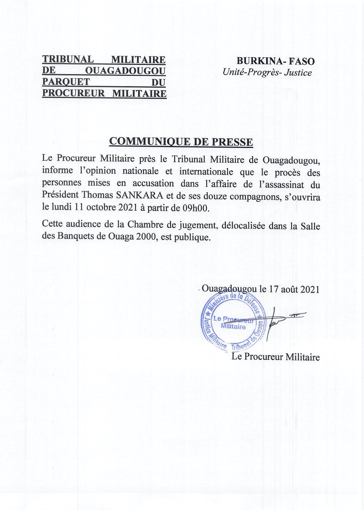 Le dossier judiciaire de Thomas Sankara évolue positivement. Selon un communiqué du Procureur militaire près le Tribunal militaire de Ouagadougou, le procès des personnes mises en accusation dans l’affaire de l’assassinat du Président Thomas Sankara et de ses douze compagnons, s’ouvrira le lundi 11 octobre 2021 à partir de 9h 00.