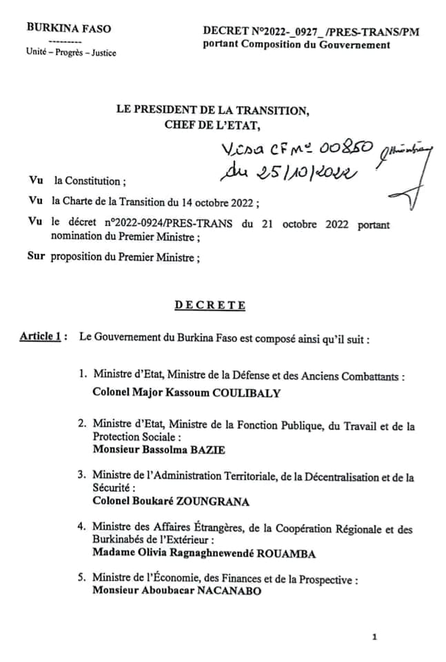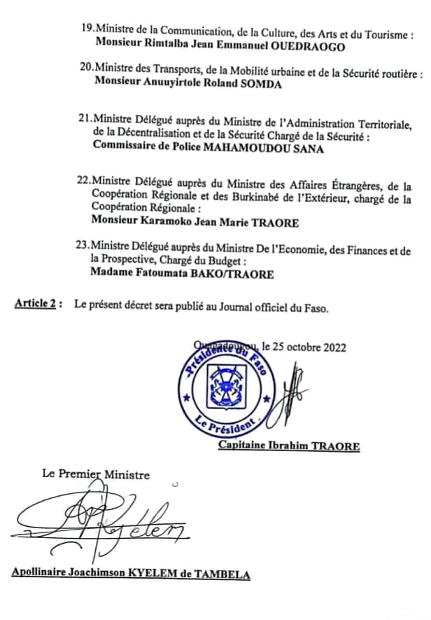 On note aussi la présence de deux militaires a des postes purement stratégiques dans le nouveau gouvernement. En effet, le Ministre d’État, le colonel major Kassoum Coulibaly, hérite du portefeuille de la Défense et des Anciens combattants. Le colonel Boukaré Zoungrana, commandant de la brigade de veille et de défense patriotique, est le ministre de l’Administration territoriale et à la Sécurité. Il sera appuyé par le commissaire de police Mahamoudou Sana, ministre délégué, chargé de la sécurité.