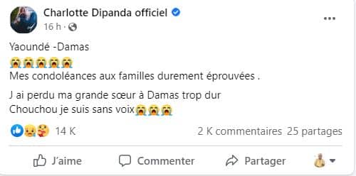 Parmi les personnes décédées lors de cet affaissement du terrain figure la grande-sœur de la chanteuse Charlotte Dipanda. Dans un message posté sur sa page Facebook ce lundi, la compagne de Fernand Lopez a annoncé la nouvelle à ses fans avant de présenter ses condoléances aux familles éplorées.