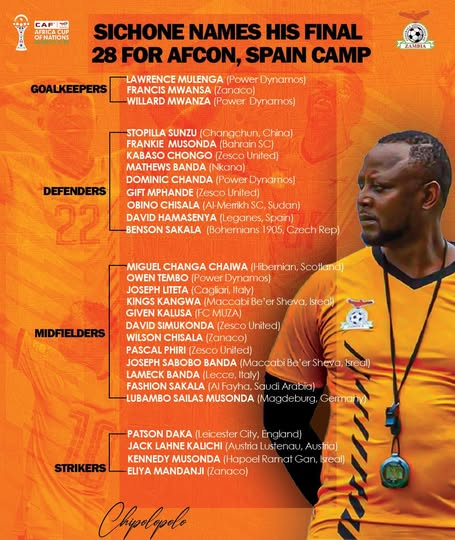 Read in EnglishLe sélectionneur national de la Zambie, Moses Sichone, a communiqué la liste des joueurs retenus pour la phase finale de la CAN 2025. Le tournoi aura lieu au Maroc, du 21 décembre 2025 au 18 janvier 2026. Le coach des Chipolopolos a fait appel à un groupe de 28 hommes.