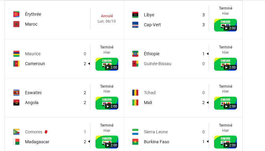 Dans le même temps, l’Égypte a validé son ticket pour la compétition. Les Pharaons se sont imposés 3-0 face à Djibouti, avec un doublé de Mohamed Salah. Avec cinq points d’avance sur le Burkina Faso, victorieux de la Sierra Leone (1-0), les Égyptiens sont déjà assurés de participer au grand rendez-vous de l’été prochain.