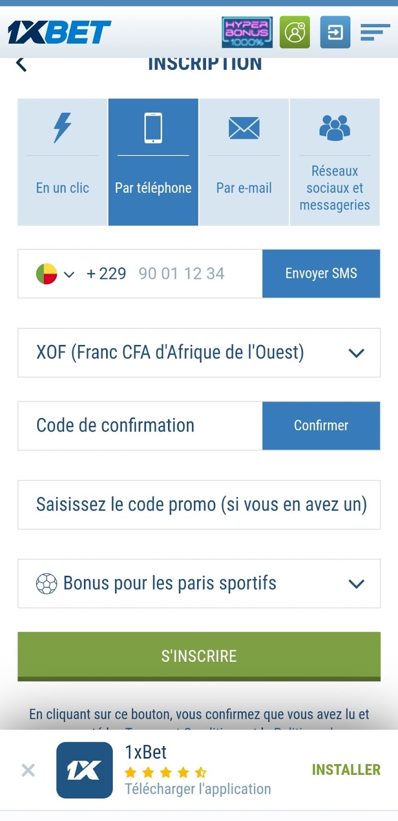 Pour utiliser le bonus d’inscription et les offres exclusives 1xBet Bénin sur mobile, il vous suffit de suivre ces étapes simples :