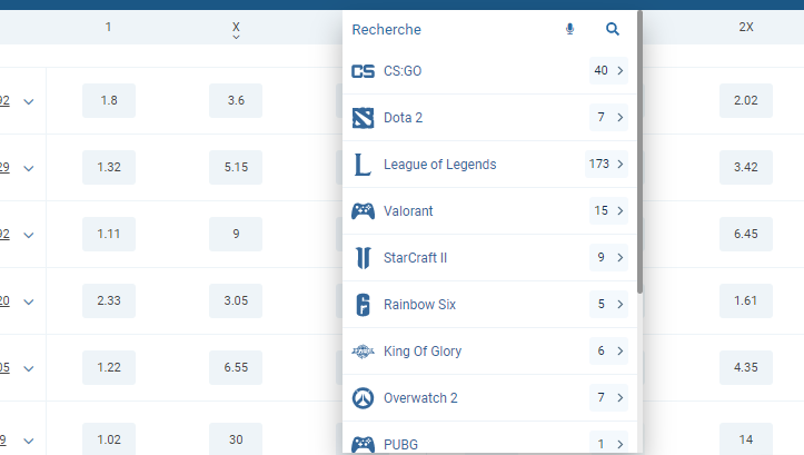 Chez 1xBet, la section eSport offre une sélection très divertissante avec plus de 135 variantes de jeux, comprenant des simulateurs de sport, des jeux de tir, RTG. Parmi les options les plus populaires, vous trouverez des jeux tels que FIFA, PUBG, League of Legends (LOL), Valorant, CS:GO, Dota 2 et bien d’autres.