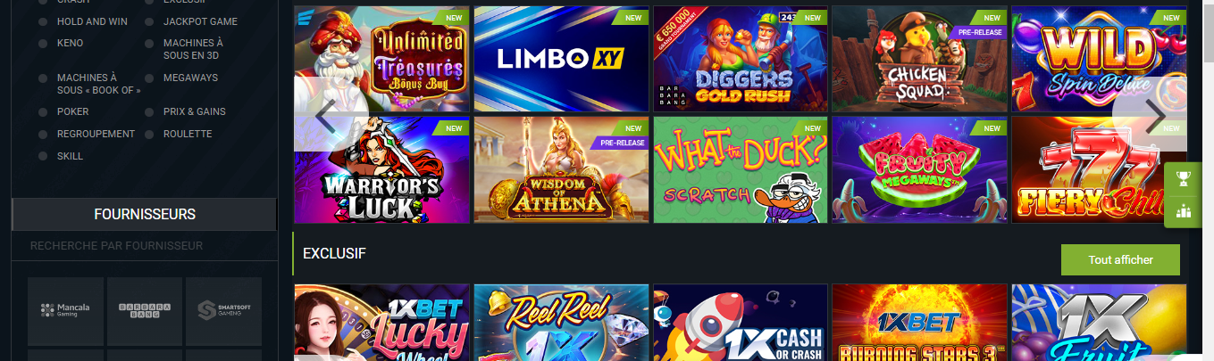 Cette section du guide des codes promo 1xBet met en lumière le casino de cet opérateur. Il propose une vaste sélection d’options de divertissement. Vous y trouverez plus de 3 000 machines à sous en ligne, ainsi que plus de 100 variantes de jeux traditionnels comme le baccarat, la roulette, la loterie, le blackjack, le poker et bien plus. Le casino collabore avec des fournisseurs réputés pour la qualité de leurs produits. Il s’agit notamment de Pragmatic Play, Ruby Play, BetSoft, Evolution Gaming et Microgaming, pour ne citer que quelques-uns.