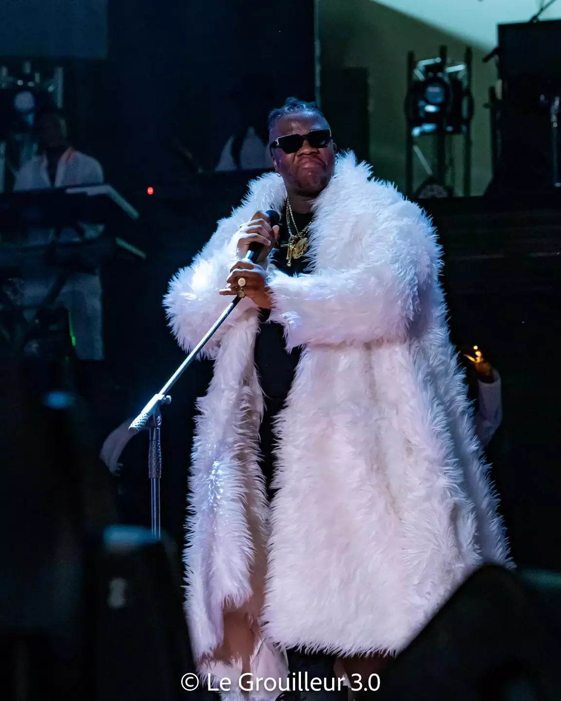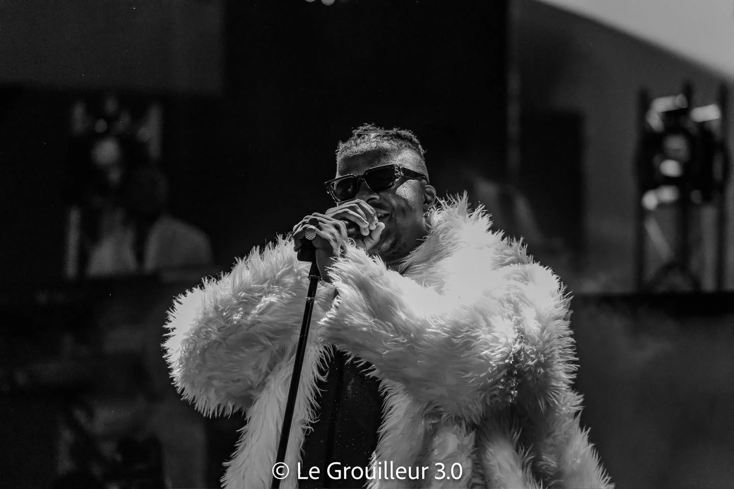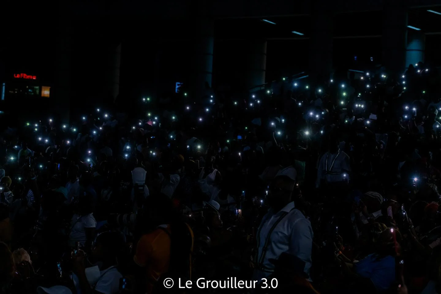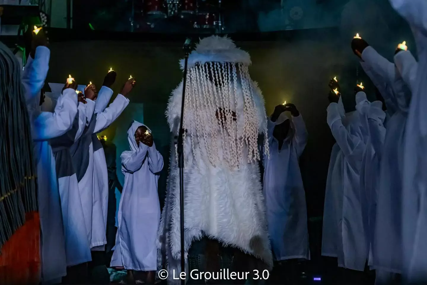Sa performance a débuté à 20 h 15 et a été précédée d’une entrée remarquable, marquée par des symboles significatifs. Avant même qu’Apoutchou ne monte sur scène, son grand frère John Jay l’a annoncé, plongeant la salle dans un silence qui a laissé place aux sons des instruments. Une procession d’enfants vêtus de blanc, portant des bougies, a suivi, puis la mère d’Apoutchou est apparue, tenant un micro, pour ensuite symboliquement remettre le micro à Apoutchou après l’avoir béni.