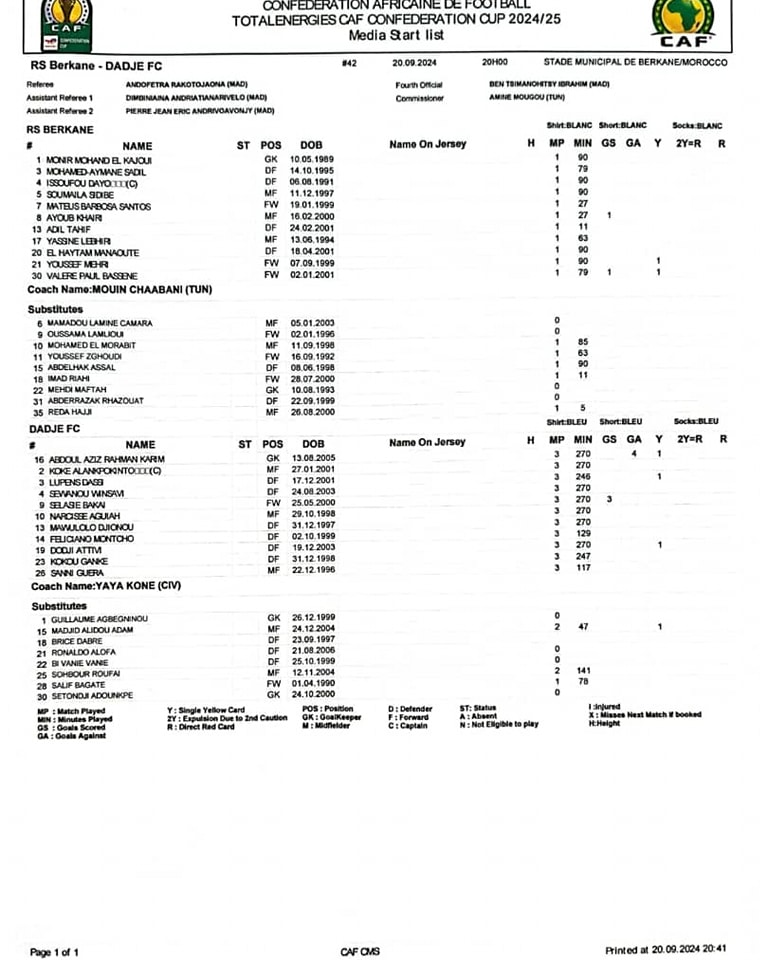 Coupe CAF (Q): les compos officielles de RS Berkane-Dadjè FC