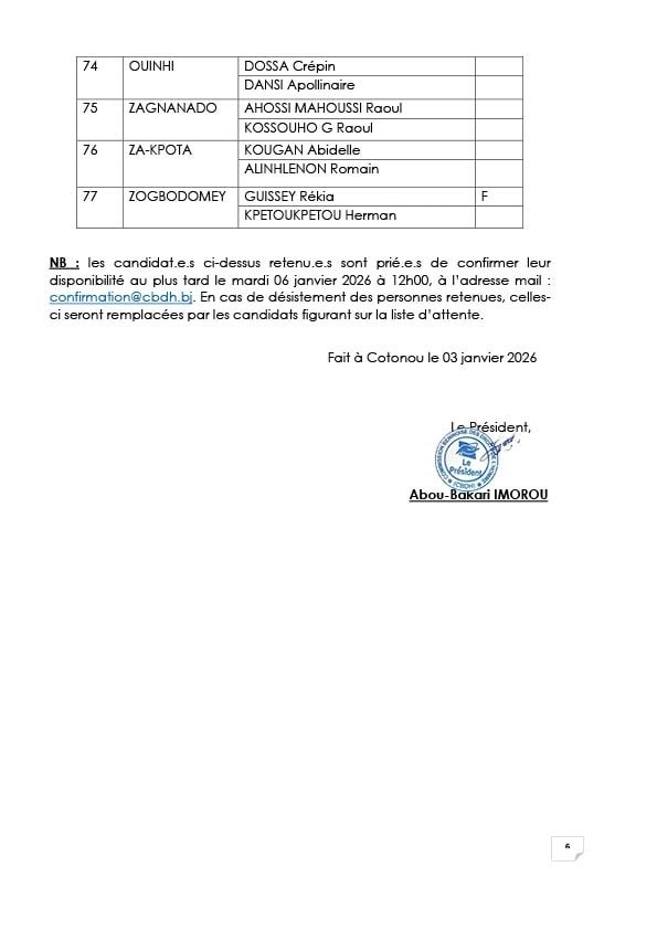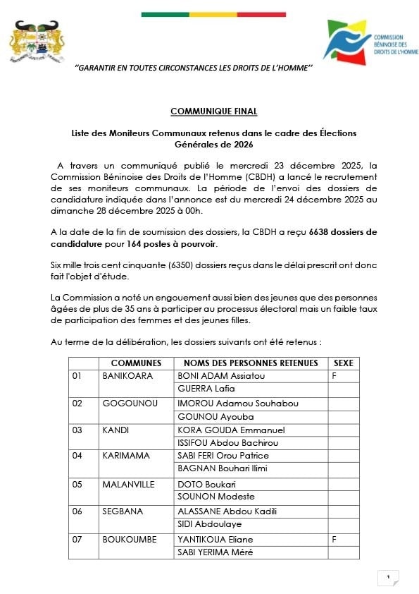 La Commission béninoise des droits de l’homme (CBDH) a publié la liste des moniteurs communaux retenus pour le suivi des élections générales de 2026. Au total, 164 moniteurs ont été sélectionnés à l’issue du processus de recrutement.