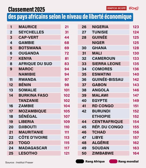 The 2025 edition of the Economic Freedom Index by “The Heritage Fondation”, reported by Agence Ecofin, paints an unflattering picture for the African continent. In the majority of countries, barriers to economic freedom remain strong, driven by persistent corruption, burdensome taxation and markets that are still insufficiently open.