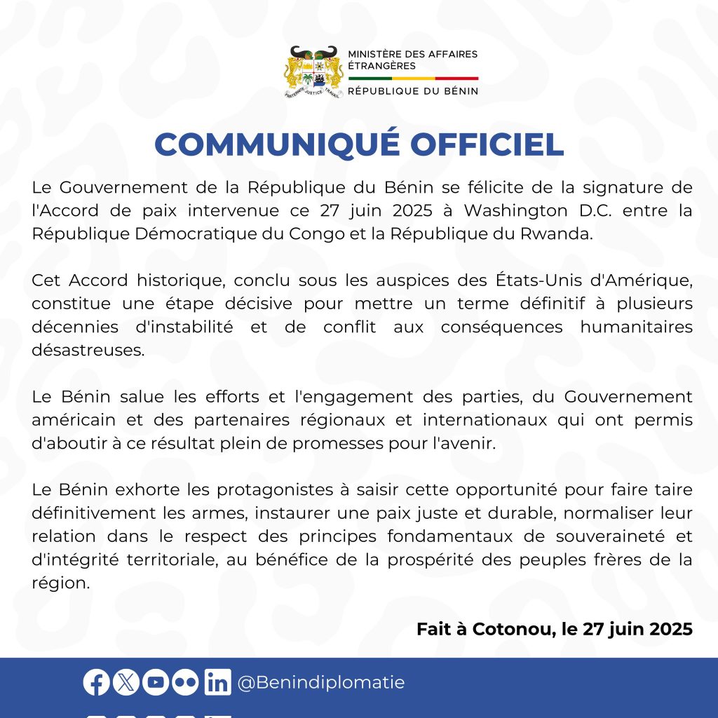 In a statement published on June 27, 2025, the Beninese government, through its foreign affairs ministry, expressed its satisfaction following the signing of the peace agreement between the Democratic Republic of Congo (DRC) and Rwanda, which took place in Washington under the auspices of the United States.