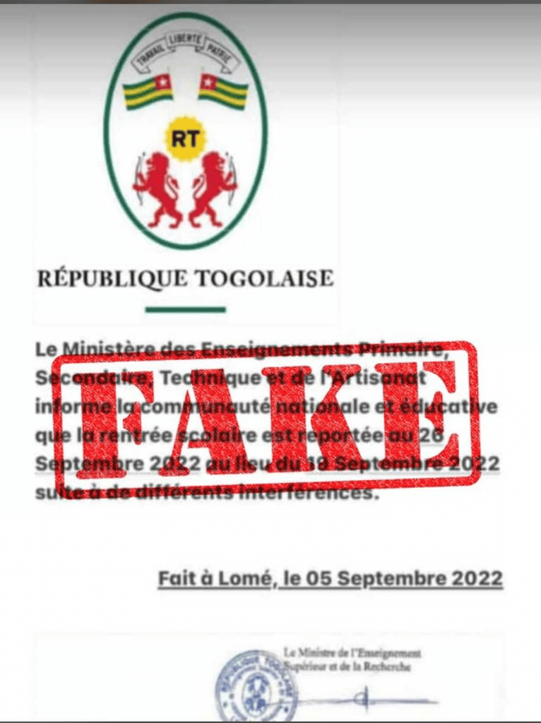 Depuis le lundi 05 septembre 2022, un supposé communiqué du ministère des Enseignements Primaire, Secondaire, Technique et de l’Artisanat du Togo, fait mention d’un report de la rentrée scolaire. Ledit communiqué, tel que libéré, « informe la communauté nationale et éducative que la rentrée scolaire est reportée au 26 septembre 2022 au lieu du 19 septembre 2022, suite à de différentes interférences ».