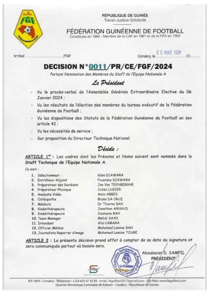 Auteur d’un bon parcours à la CAN 2023 avec le Syli national, Kaba Diawara a été reconduit à son poste de sélectionneur national de la Guinée, a annoncé la FEGUIFOOT sur ses réseaux sociaux.