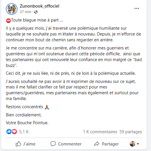 « Ceci dit, je ne suis liée, ni de près, ni de loin à la polémique actuelle. J’aurais souhaité ne pas avoir à m’exprimer de nouveau sur ce sujet, mais il me fallait clarifier ce fait par respect pour mes guerriers et guerrières, mes partenaires mais également et surtout pour ma famille », a-t-elle précisé.