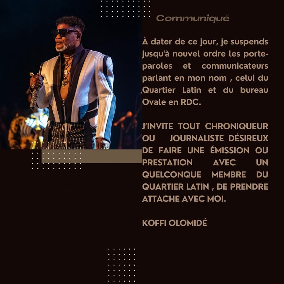 « À dater de ce jour, je suspends jusqu’à nouvel ordre les porte-paroles et communicateurs parlant en mon nom, celui du Quartier Latin et du bureau Ovale en RDC« , a lâché Koffi Olomidé.