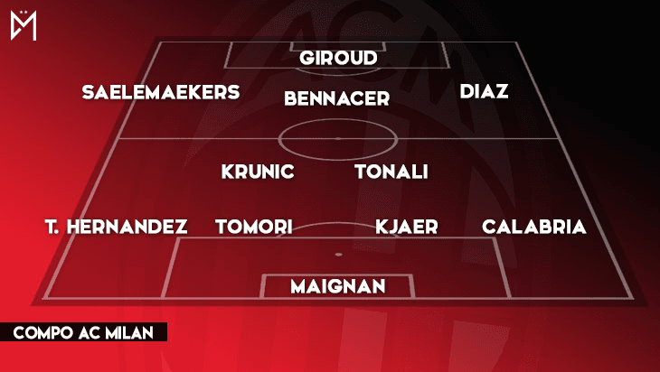 La compo probable de l’AC Milan : Maignan – Calabria, Kjaer, Tomori, Théo Hernandez – Tonali, Krunic – Diaz, Bennacer, Saelemaekers – Giroud