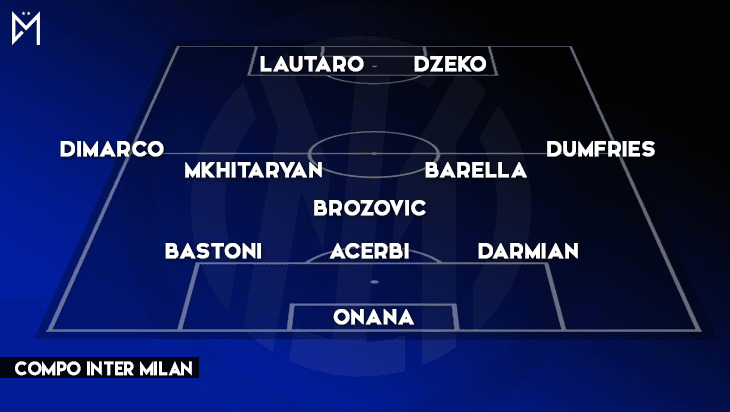 La compo probable de l’Inter Milan : Onana – Darmian, Acerbi, Bastoni – Dumfries, Barella, Brozovic, Mkhitaryan, Dimarco – Dzeko, Lautaro Martinez