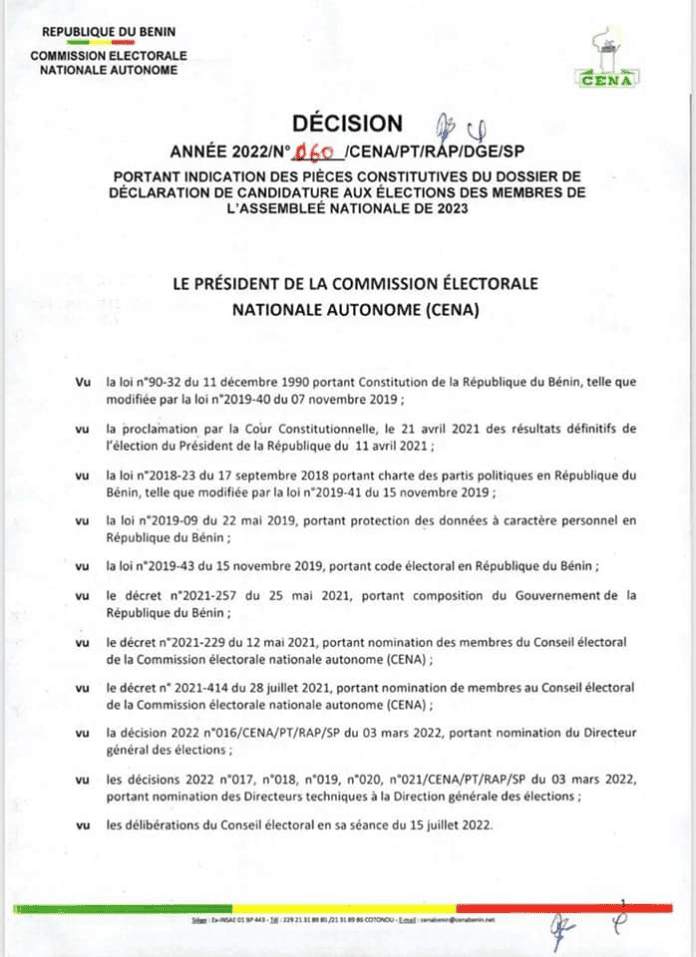 Dans une récente décision, la commission électorale nationale autonome (CENA) a spécifié les pièces à fournir dans la constitution des dossiers de déclaration de candidature aussi bien par les partis politiques en lice pour ces élections que par candidat. La liste des pièces à fournir se présente comme suit:
