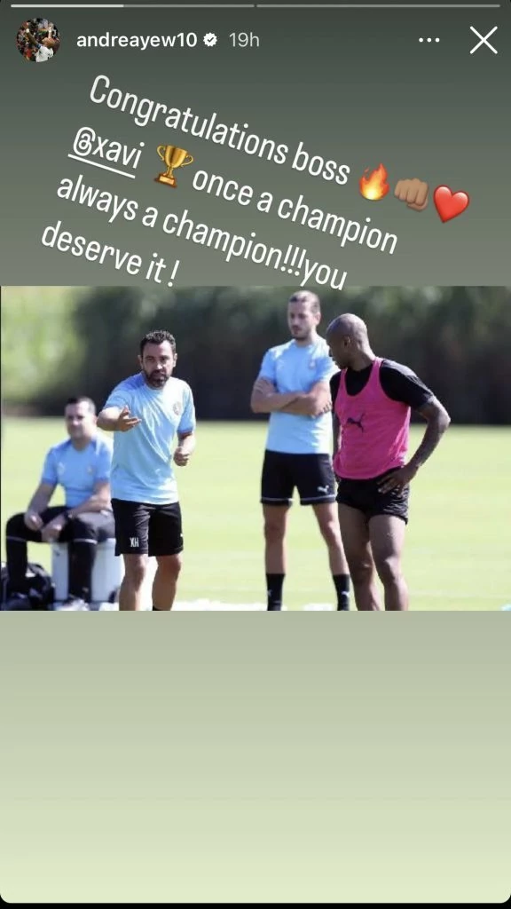 André Ayew, qui a joué et remporté de nombreux trophées sous Xavi lors de son passage à Al Sadd, a adressé ses félicitations à l’ancien milieu de terrain espagnol. Dans un post sur son histoire Instagram, le capitaine des Black Star a écrit: « Félicitations patron Xavi. Champion un jour, champion toujours. Tu le mérite.«