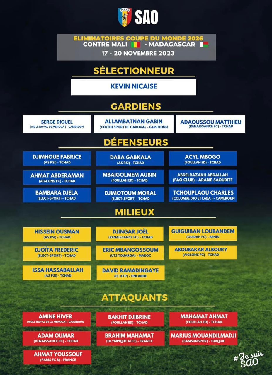 27 joueurs dont 16 évoluant dans le championnat local ont été convoqués par le sélectionneur du Tchad, Kévin Nicaise, pour le rassemblement de novembre. Les Sao affrontent le Mali et Madagascar, les 17 et 20 novembre prochain.