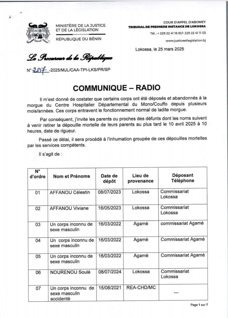 Dans un communiqué daté du 25 mars 2025 et relayé par Le Matinal, il leur demande d’accomplir les formalités nécessaires pour récupérer les dépouilles avant le 10 avril 2025. Passé ce délai, une inhumation collective sera effectuée.