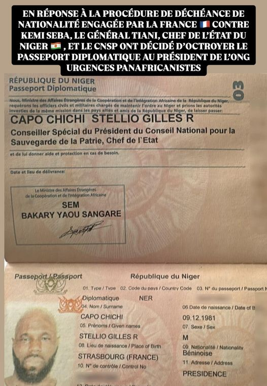 En effet, il déclare : « En réponse à la procédure de déchéance de ma nationalité commise par la Françafrique contre ma personne (dont l’objectif inavoué était de tenter de limiter mes déplacements, et ainsi freiner la portée de mes actions anticolonialistes), le général révolutionnaire et visionnaire Abdourahamane TIANI, chef de l’État du Niger, accompagné des valeureux membres du CNSP (qui, depuis leur prise de pouvoir il y a un an de cela maintenant, mènent une révolution Historique au Sahel), a décidé de m’octroyer le passeport diplomatique, eu égard au combat que je mène depuis 25 ans pour l’Afrique, ce au péril de ma vie. »