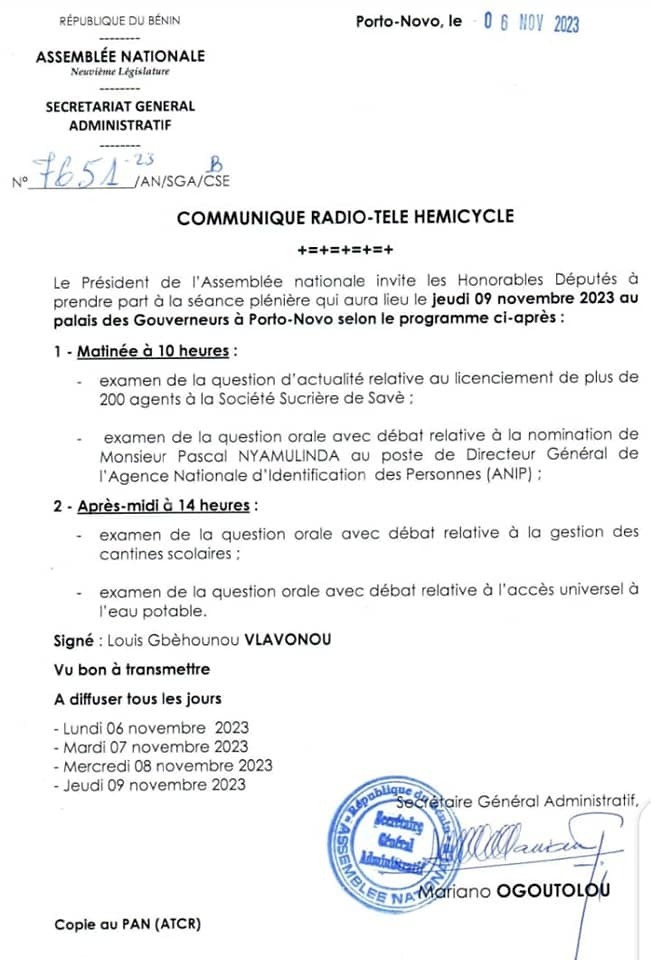 Entre autres points, il sera question de l’examen de la question d’actualité relative au licenciement de plus de 200 agents à la SUCOBE SA de Savè, l’examen de la question orale avec débat relative à la nomination de Mr Pascal NYAMULINDA au poste de Directeur Général de l’Agence Nationale d’Identification des Personnes (ANIP), de l’examen de la question orale avec débat relative à la gestion des cantines scolaires ainsi que l’examen de la question orale avec débat relative à l’accès universel à l’eau potable.