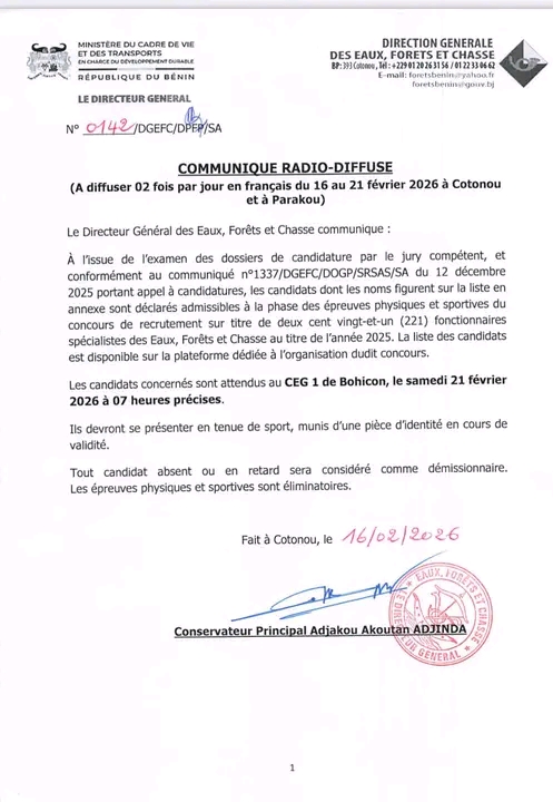 Dans un communiqué, le Directeur général, le Conservateur principal Adjakou Akoutan Adjinda, informe que les épreuves physiques se dérouleront le samedi 21 février 2026 au CEG 1 de Bohicon, à partir de 7 heures précises.