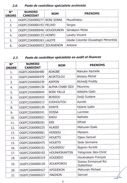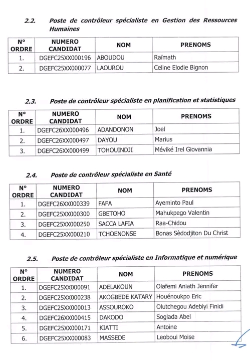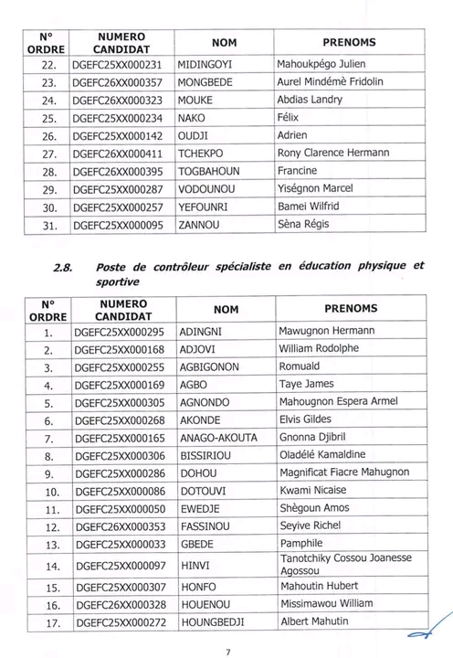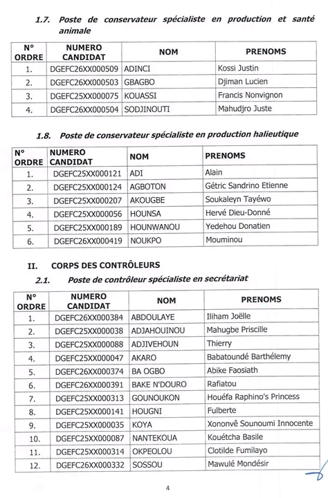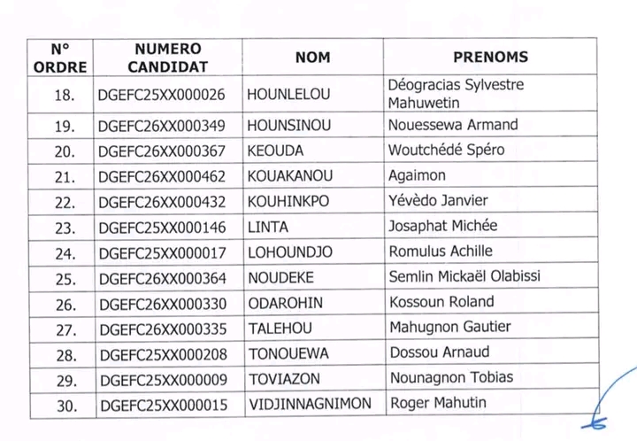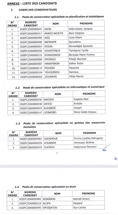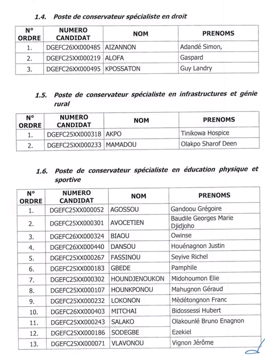 La Direction générale des Eaux, Forêts et Chasse a publié la liste des candidats retenus pour la phase sportive du concours de recrutement de 221 fonctionnaires spécialistes. Les épreuves auront lieu le 21 février 2026 au CEG 1 de Bohicon.