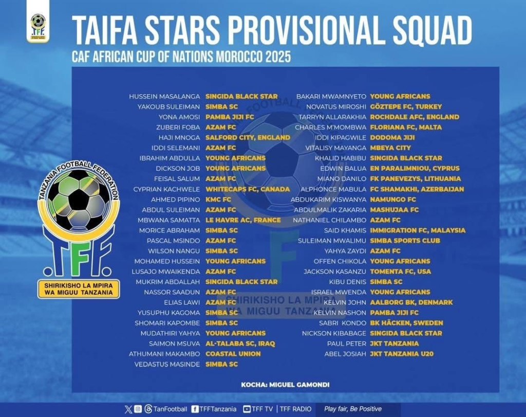Le sélectionneur de la Tanzanie, Miguel Gamondi, a retenu 53 joueurs pour entamer la préparation de la CAN 2025, avec une forte présence du championnat local et plusieurs cadres expatriés, avant un premier choc face au Nigeria.