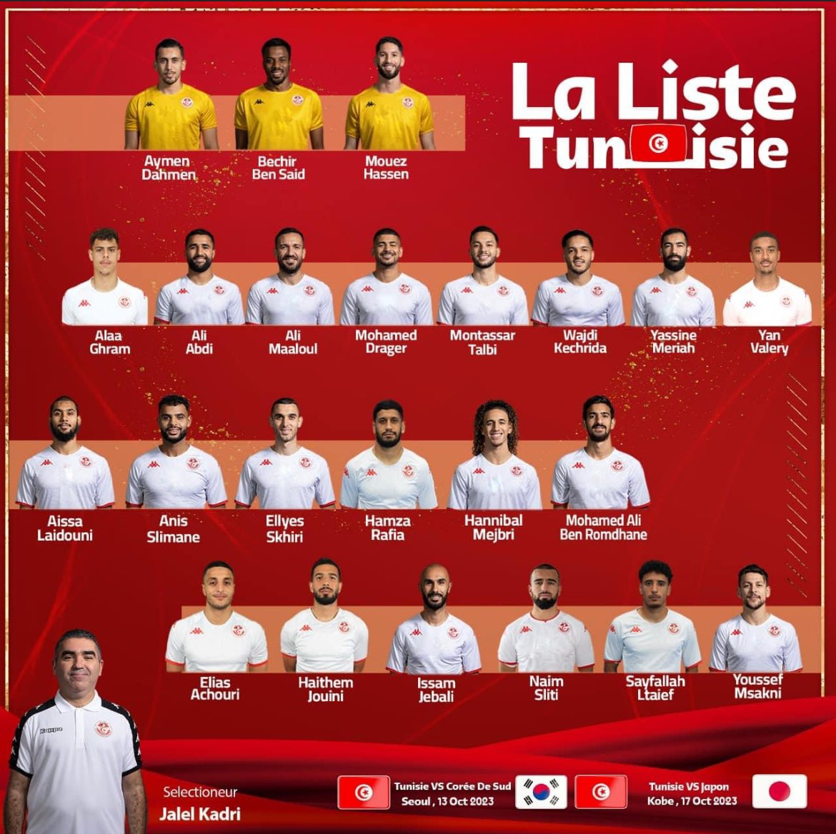 Pour sa trêve internationale d’octobre, la Tunisie séjournera en Asie. Les Aigles de Carthage affronteront la Corée du Sud le vendredi 13 octobre à Séoul et joueront ensuite contre le Japon le mardi 17 octobre à Kobe. Pour cette double confrontation, le sélectionneur Jalel Kadri a fait appel à 23 joueurs.