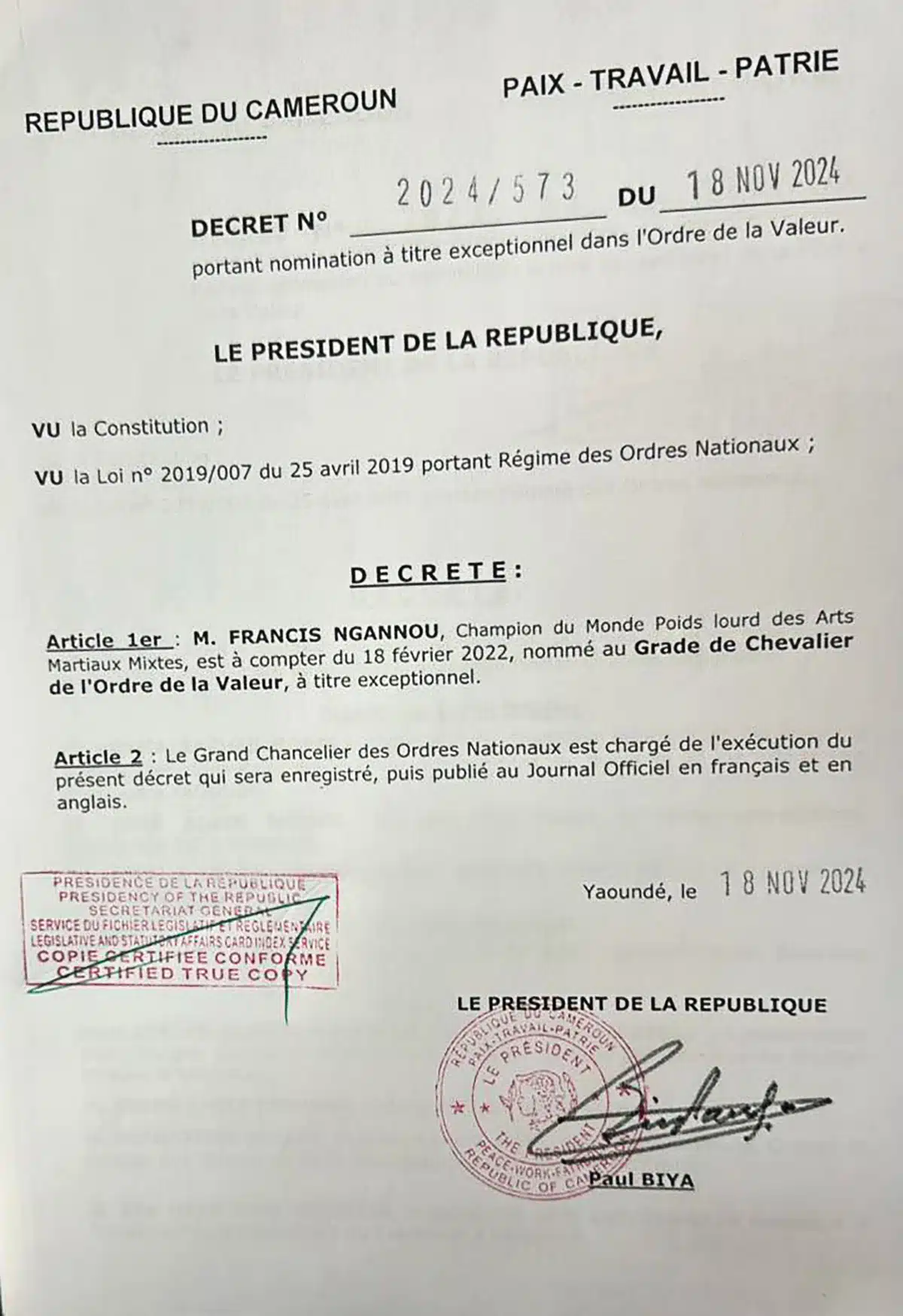 Le décret présidentiel promouvant le boxeur Francis Ngannou au grade de Chevalier de l’Ordre de la Valeur a été signé par le président Paul Biya le lundi 18 novembre 2024.