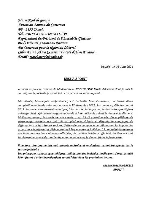Dans cette polémique grandissante, Marie Princesse Ndoun Issie a pris la parole le lundi 3 juin par l’intermédiaire de son conseil juridique. À travers un communiqué sévère partagé sur sa page Facebook, Miss Cameroun 2023 met en garde toutes les personnes diffusant des propos diffamatoires à son encontre sur la toile. Elle annonce également que des investigations et des procédures judiciaires ont déjà été engagées contre toute personne affirmant sur Méta qu’elle entretient une relation avec l’époux de l’influenceuse Murielle Blanche.