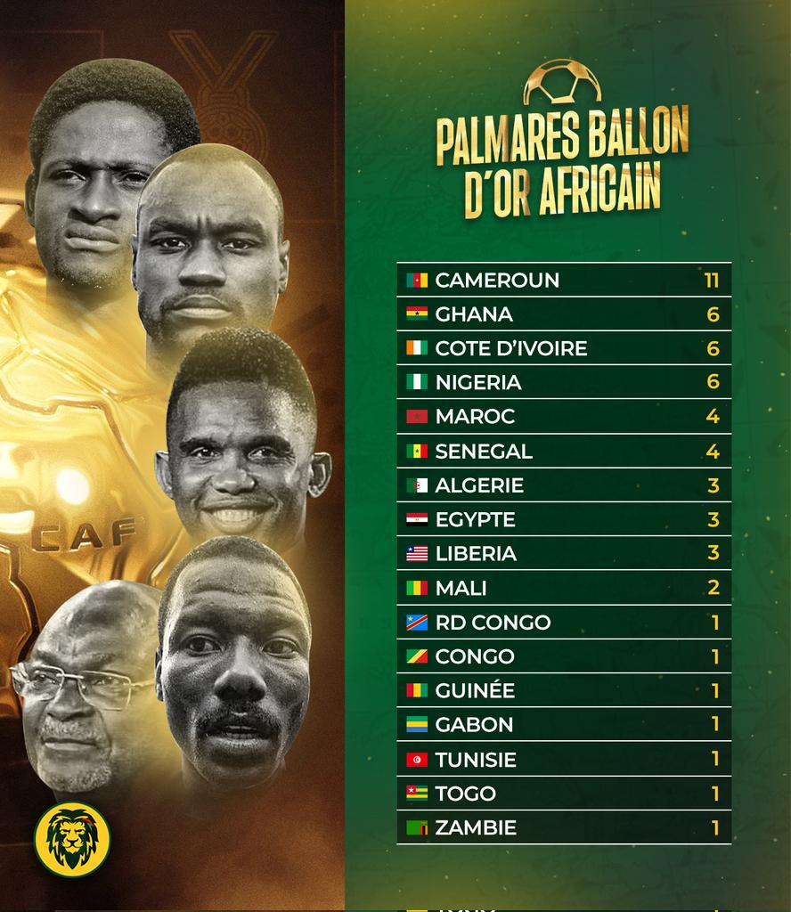Avec ce sacre de son joueur, le Nigeria porte son total dans le classement du Ballon d’Or à 6. Le géant ouest-africain rejoint le Ghana et la Côte d’Ivoire qui en comptent également 6 représentants. En tête de liste, on retrouve le Cameroun, leader incontesté avec ses 11 titres alors que le Maroc complète le podium avec 4 récompenses, au côté du Sénégal, également 4 Ballons d’Or. En bas du tableau, on note la présence du Gabon, du Togo ou encore de la Tunisie et de la Zambie qui en comptent un trophée chacun. Le Bénin est lui, absent de cette prestigieuse liste.